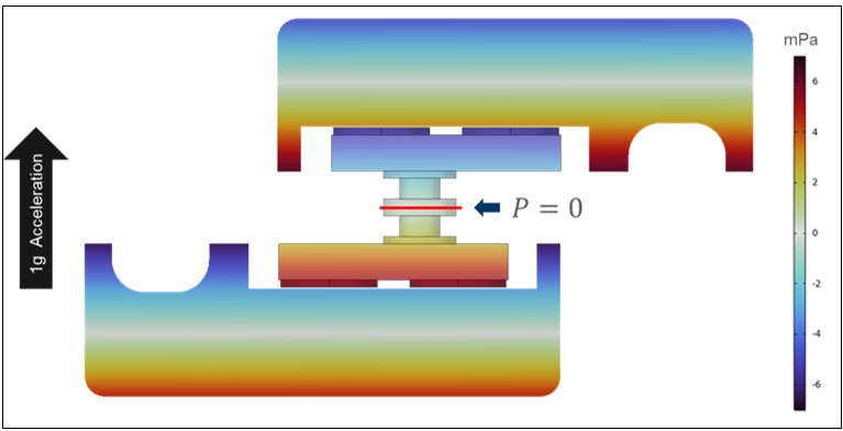 Figure 2. Acoustic simulation demonstrating zero pressure at the shared port of paired MEMS microphones. A cross section of both front volumes and both back volumes is shown.