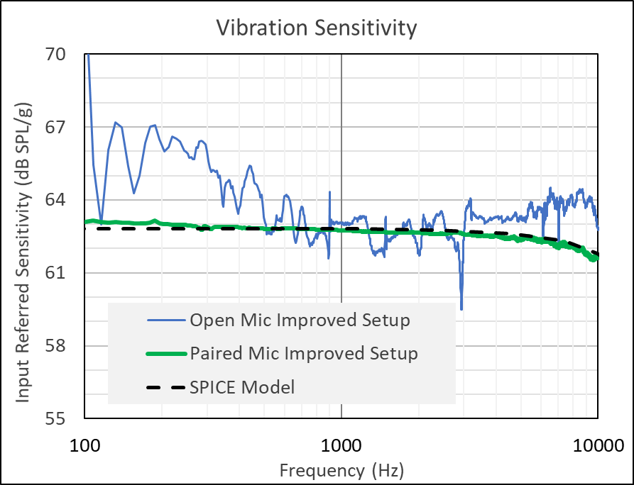 Figure 3. Plot showing microphone vibration sensitivity vs. frequency. Previous methods (one example shown in blue) were noisy and often inaccurate. The paired microphone approach (green) is clean and matches nearly identically with simulation (black).