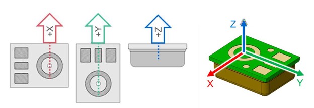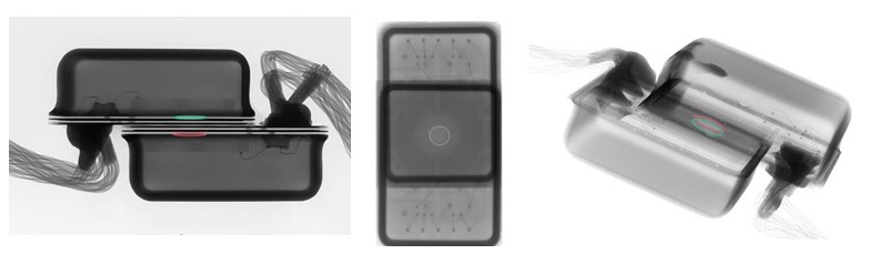 Figure 1. X-Rays of conjoined pairs of Knowles MEMS microphones, highlighting port alignment. (Left) Side view, (Center) Top view, and (Right) Oblique view.